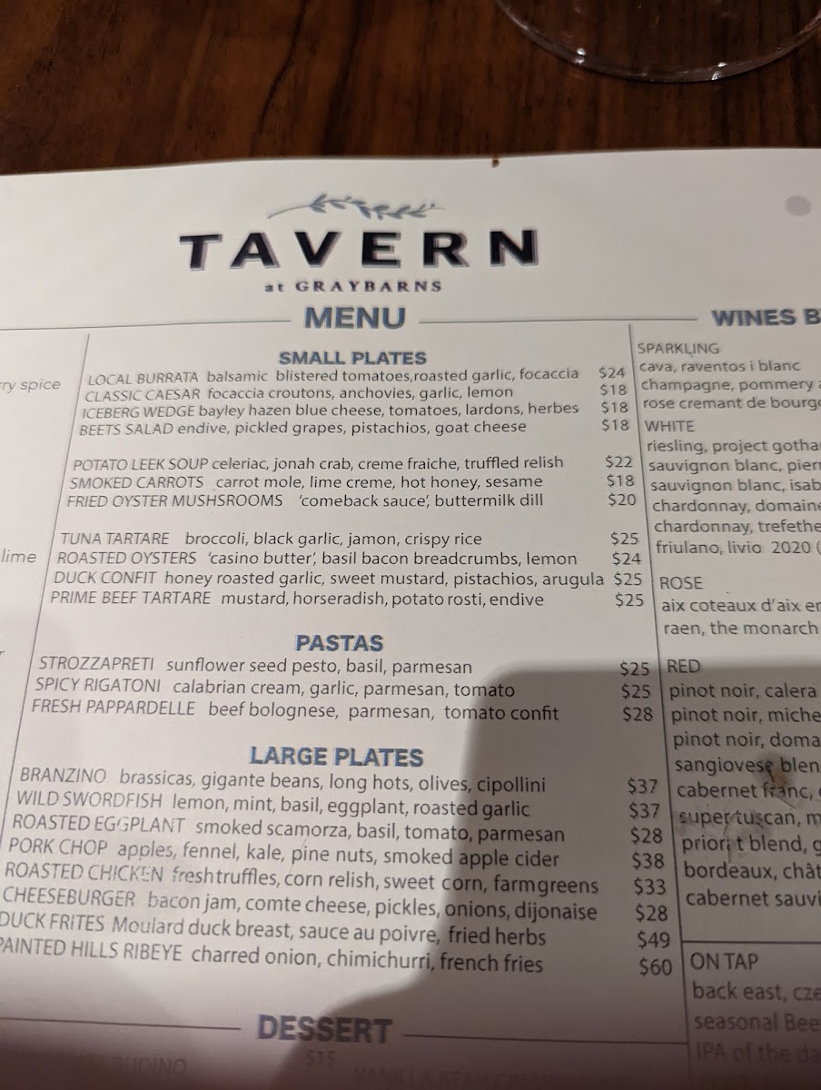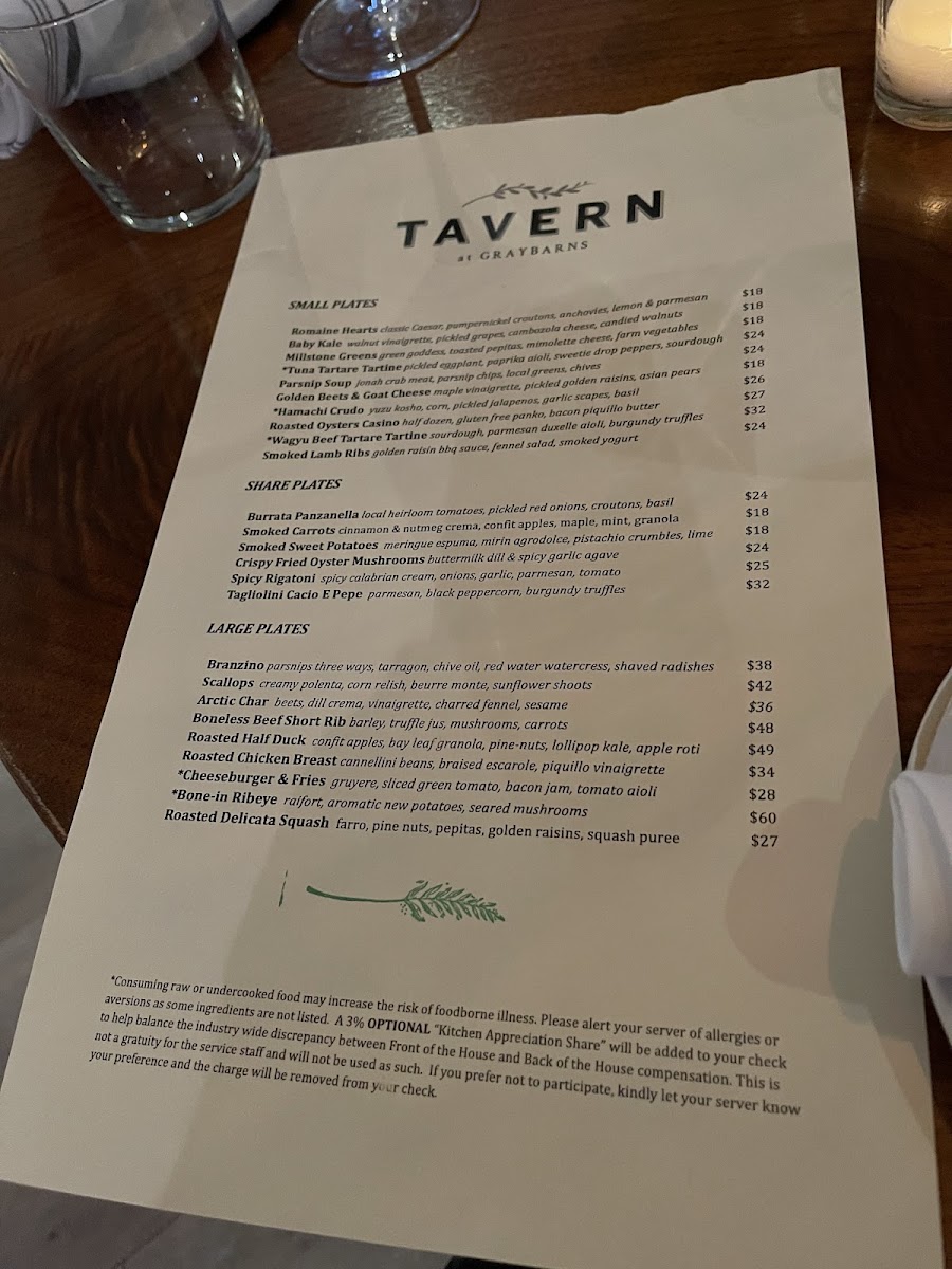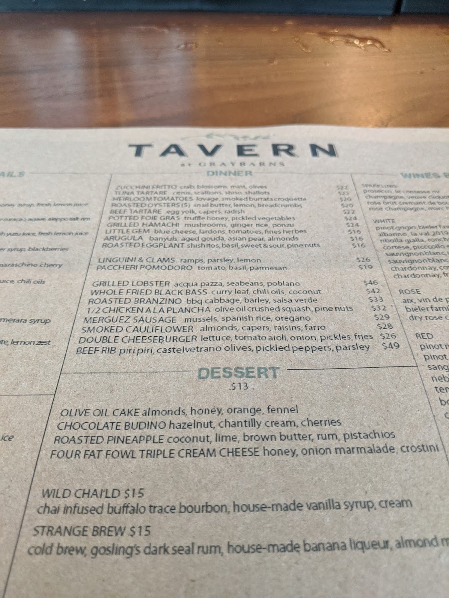 The menu at Tavern at GrayBarns offers a thoughtful blend of refined yet approachable dishes, designed for sharing and savoring in a relaxed, inviting setting. From carefully crafted small plates like roasted oysters and tuna tartare to hearty main courses such as lamb ribs and whole branzino, the selections provide a balance between comfort and culinary interest.